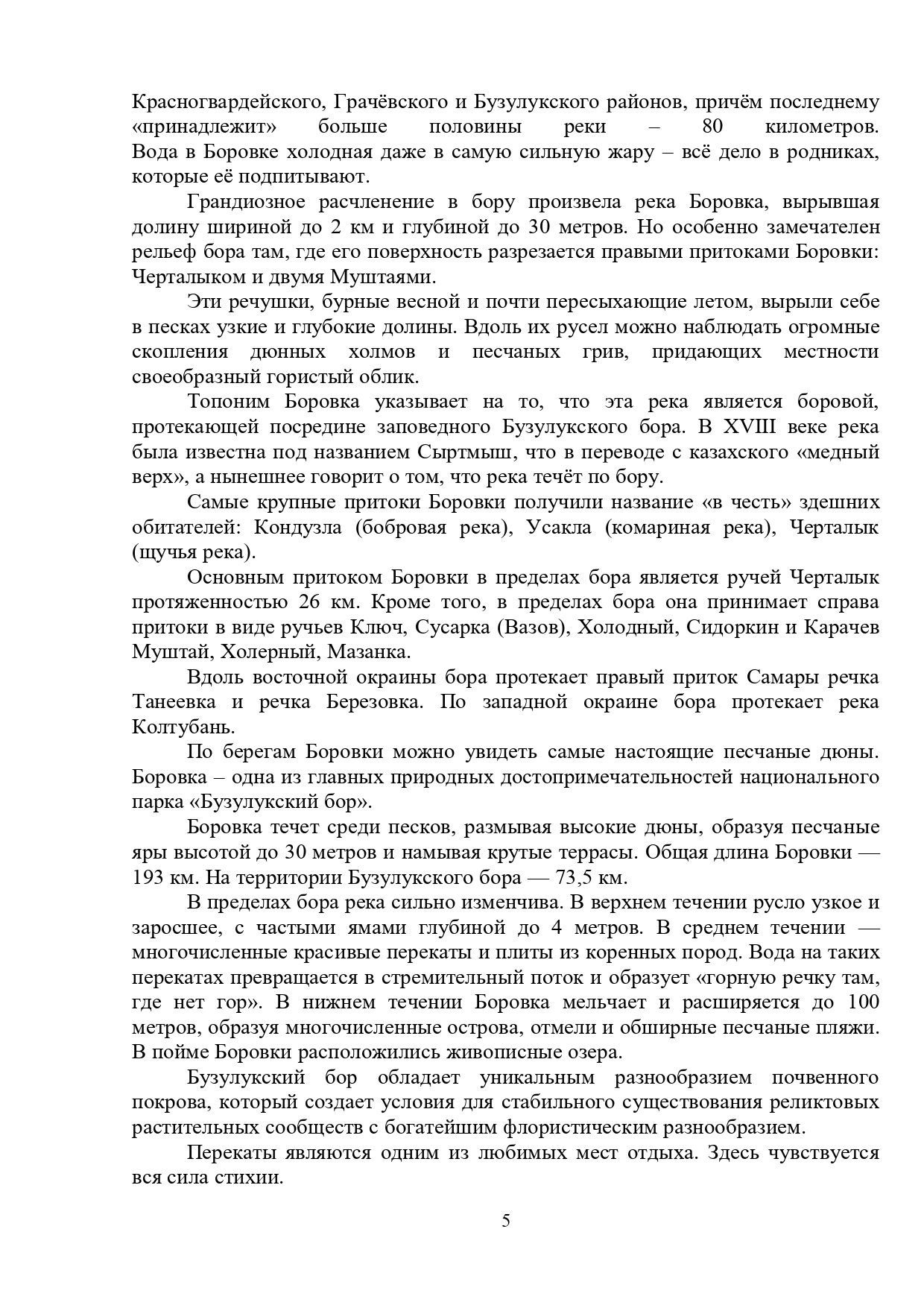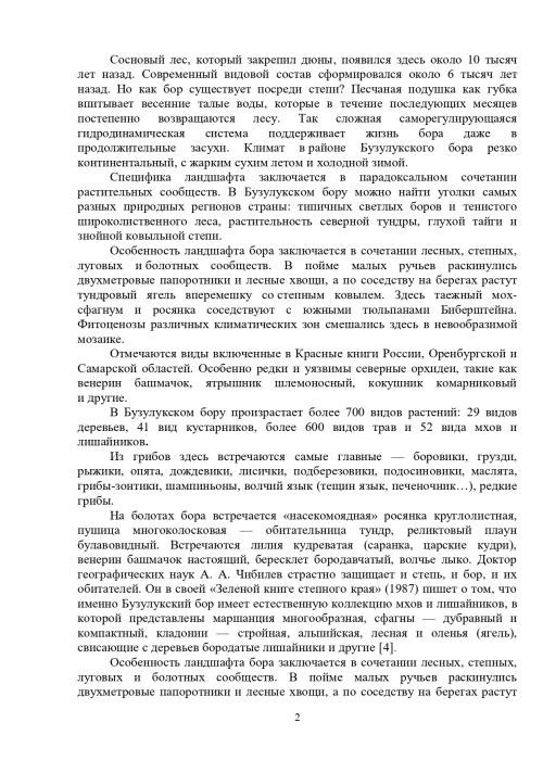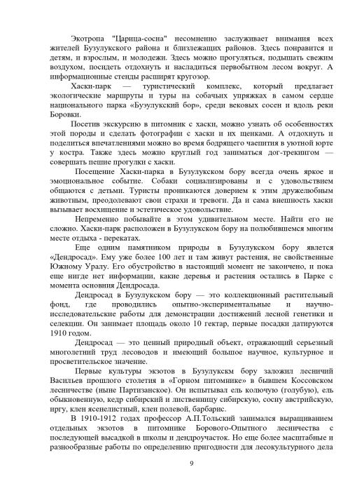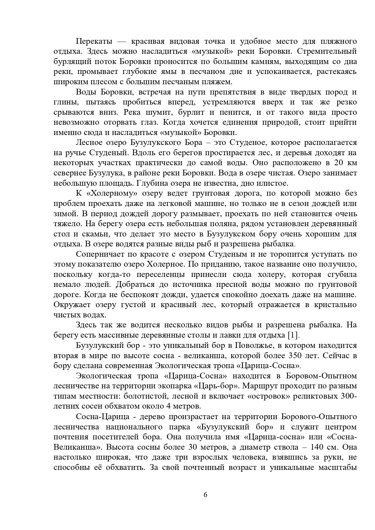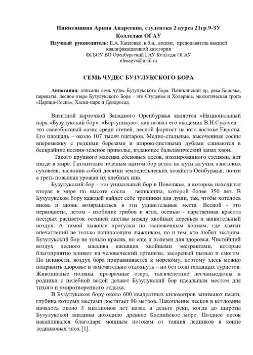 Аннотация: описаны семь чудес Бузулукского бора: Паникинский яр, река Боровка, перекаты, лесное озеро Бузулукского Бора – это Студеное и Холерное, экологическая тропа «Царица-Сосна», Хаски-парк и Дендросад.