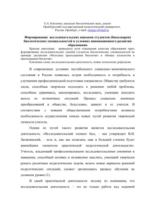 Формирование исследовательских навыков студентов (бакалавров) биологических специальностей в условиях инновационного развития образования