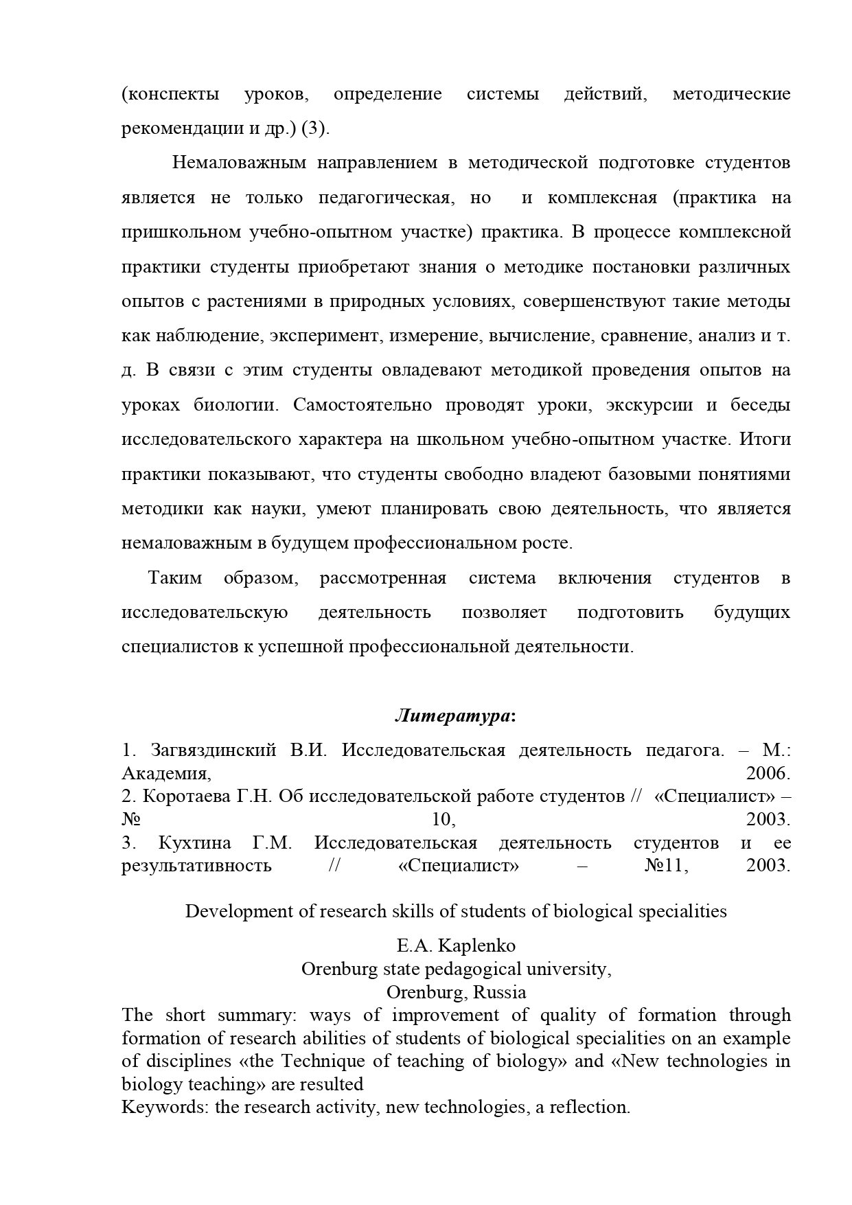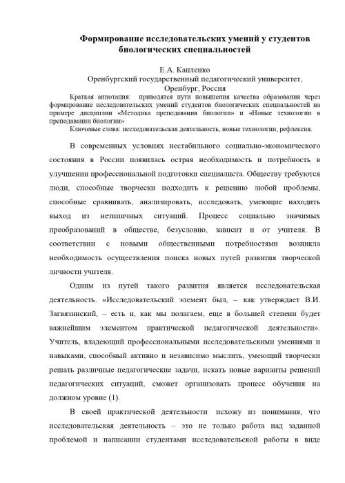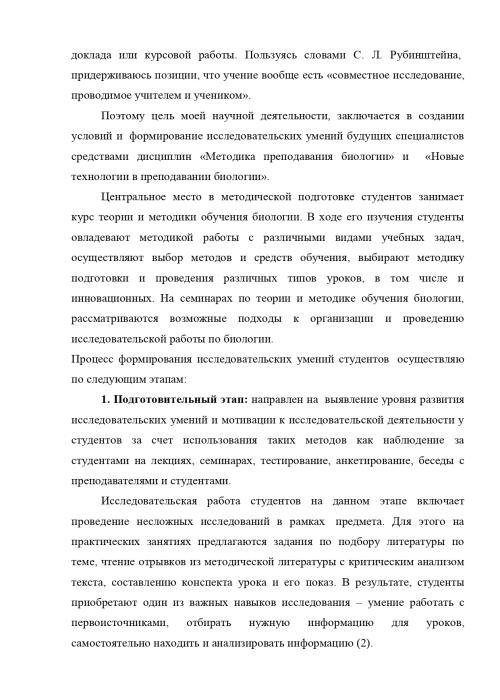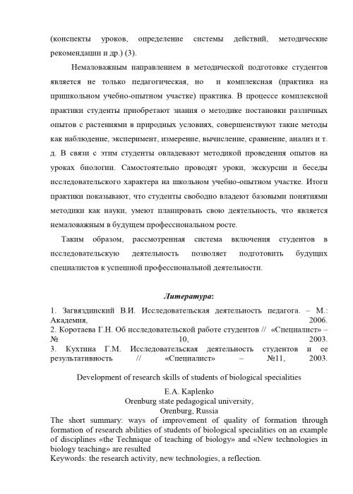 The short summary: ways of improvement of quality of formation through formation of research abilities of students of biological specialities on an example of disciplines «the Technique of teaching of biology» and «New technologies in biology teaching» are resulted