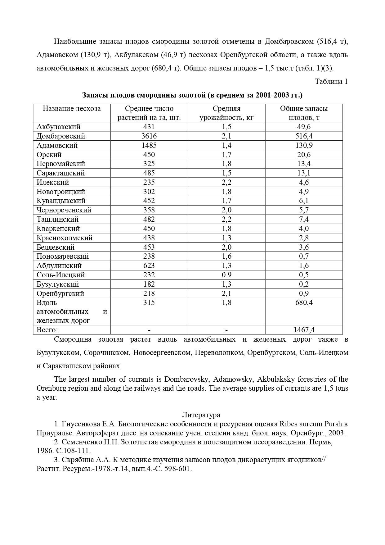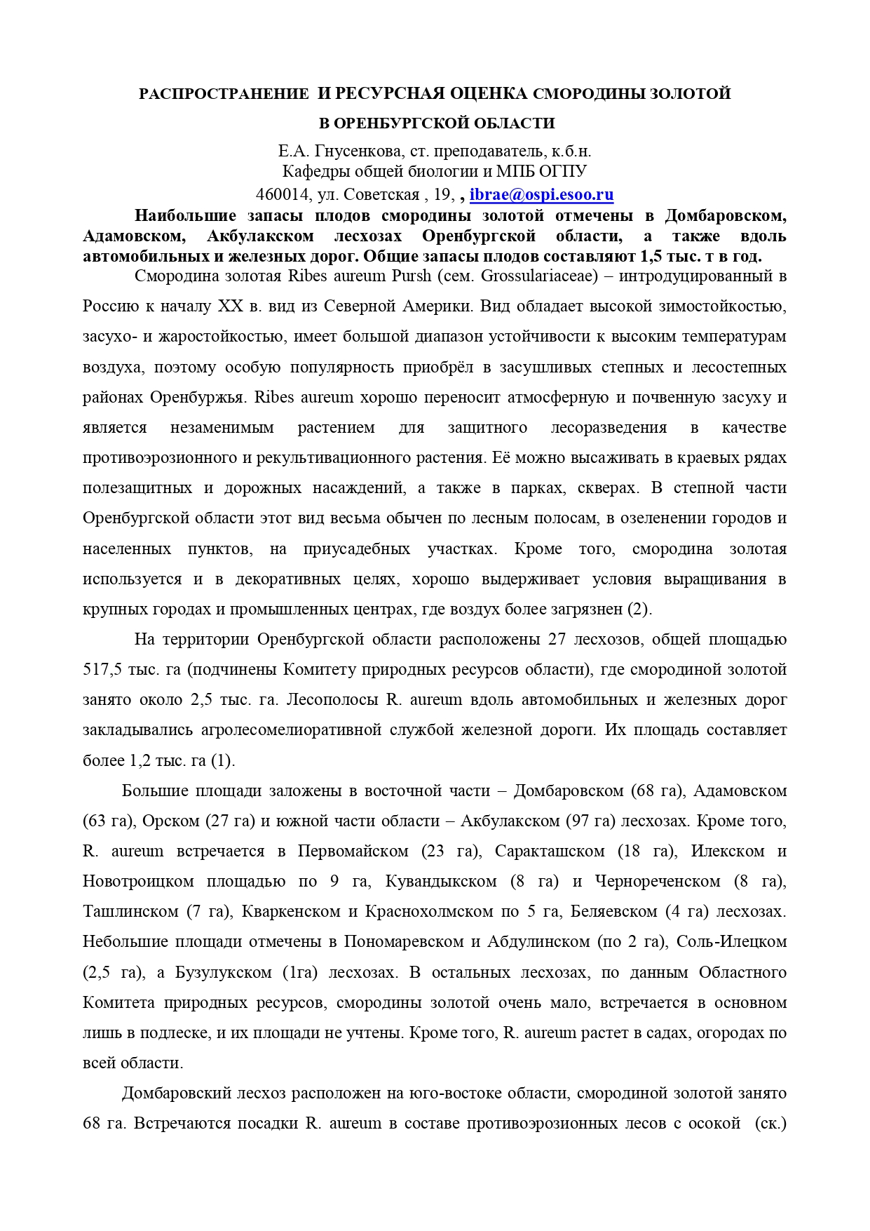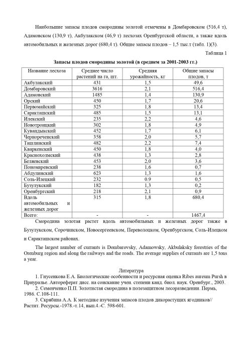 Статья "РАСПРОСТРАНЕНИЕ И РЕСУРСНАЯ ОЦЕНКА СМОРОДИНЫ ЗОЛОТОЙ В ОРЕНБУРГСКОЙ ОБЛАСТИ"