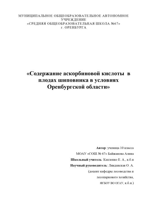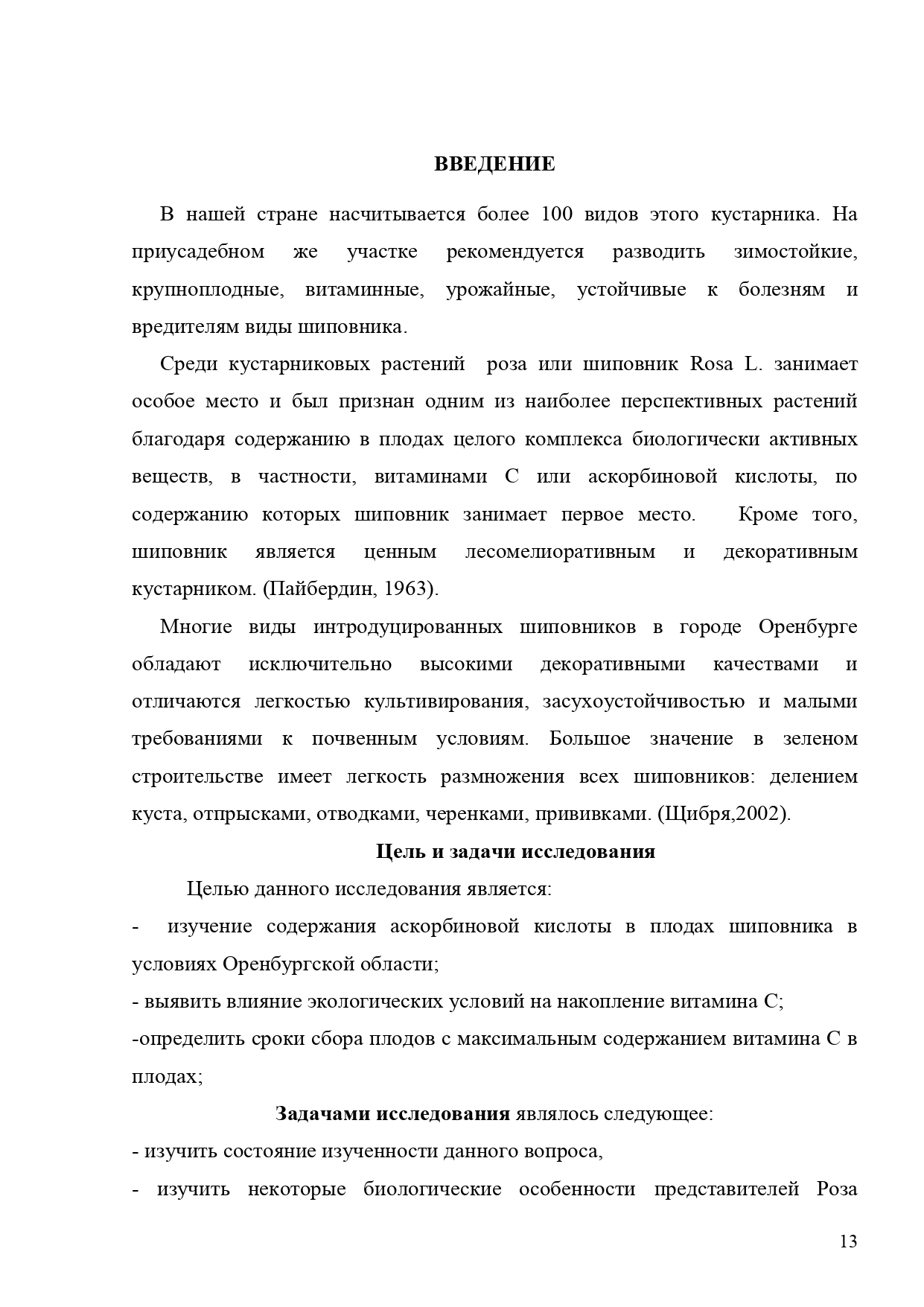 Целью данного исследования является: изучение содержания аскорбиновой кислоты в плодах шиповника в условиях Оренбургской области; выявить влияние экологических условий на накопление витамина C; определить сроки сбора плодов с максимальным содержанием витамина С в плодах; Задачами исследования являлось следующее: изучить состояние изученности данного вопроса, изучить некоторые биологические особенности представителей Роза майская (R. majalis Herm.) и Роза собачья (R. canina α); определить содержание аскорбиновой кислоты в плодах шиповника в условиях Оренбургской области.