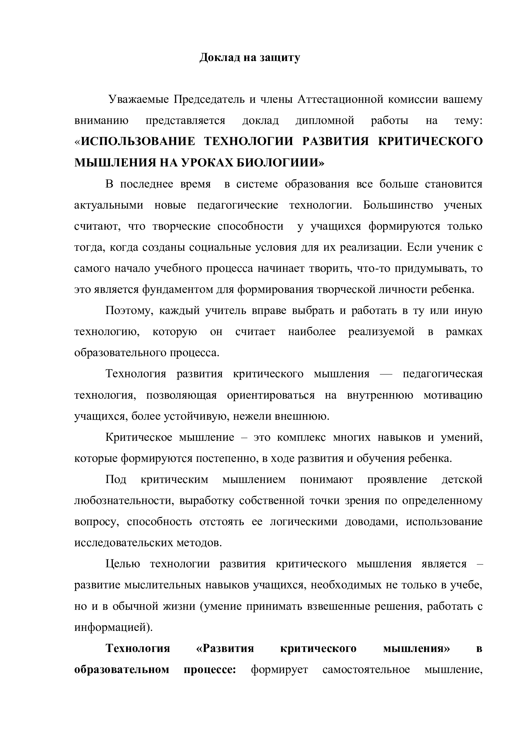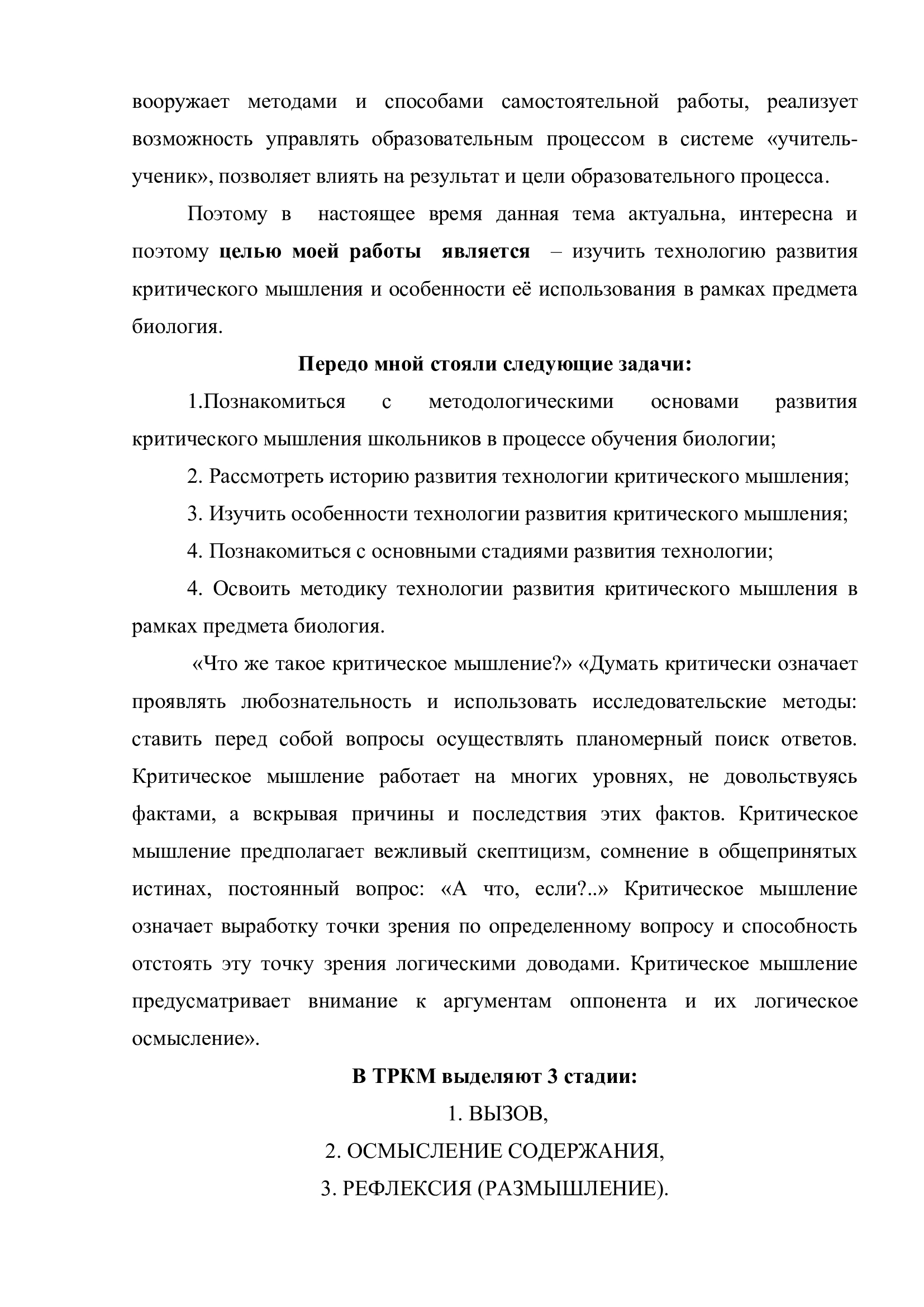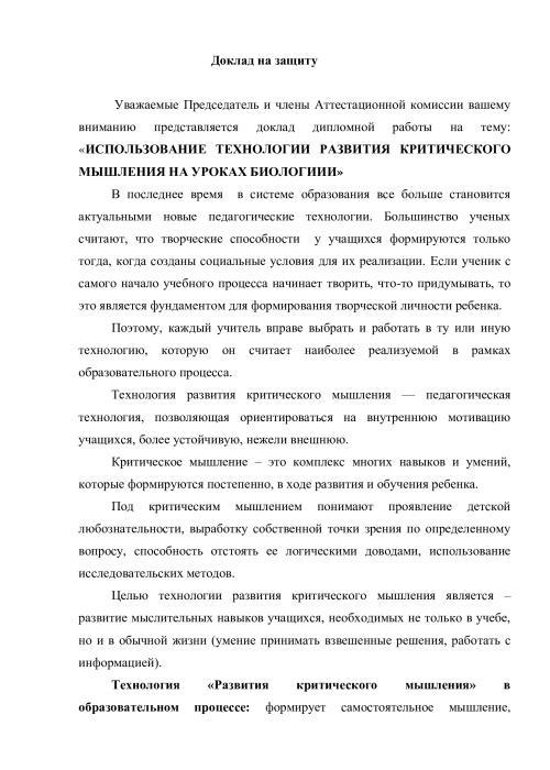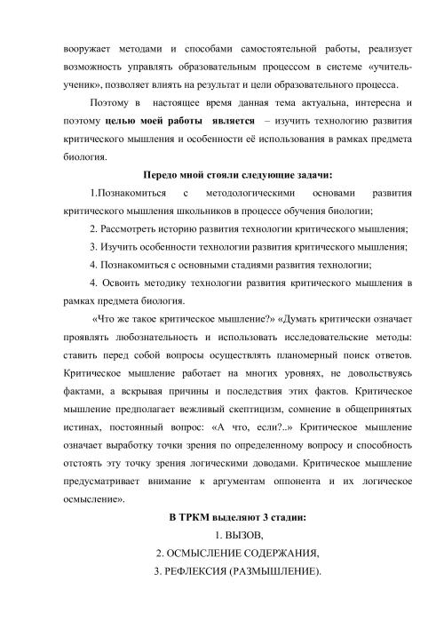 ИСПОЛЬЗОВАНИЕ ТЕХНОЛОГИИ РАЗВИТИЯ КРИТИЧЕСКОГО МЫШЛЕНИЯ НА УРОКАХ БИОЛОГИИИ