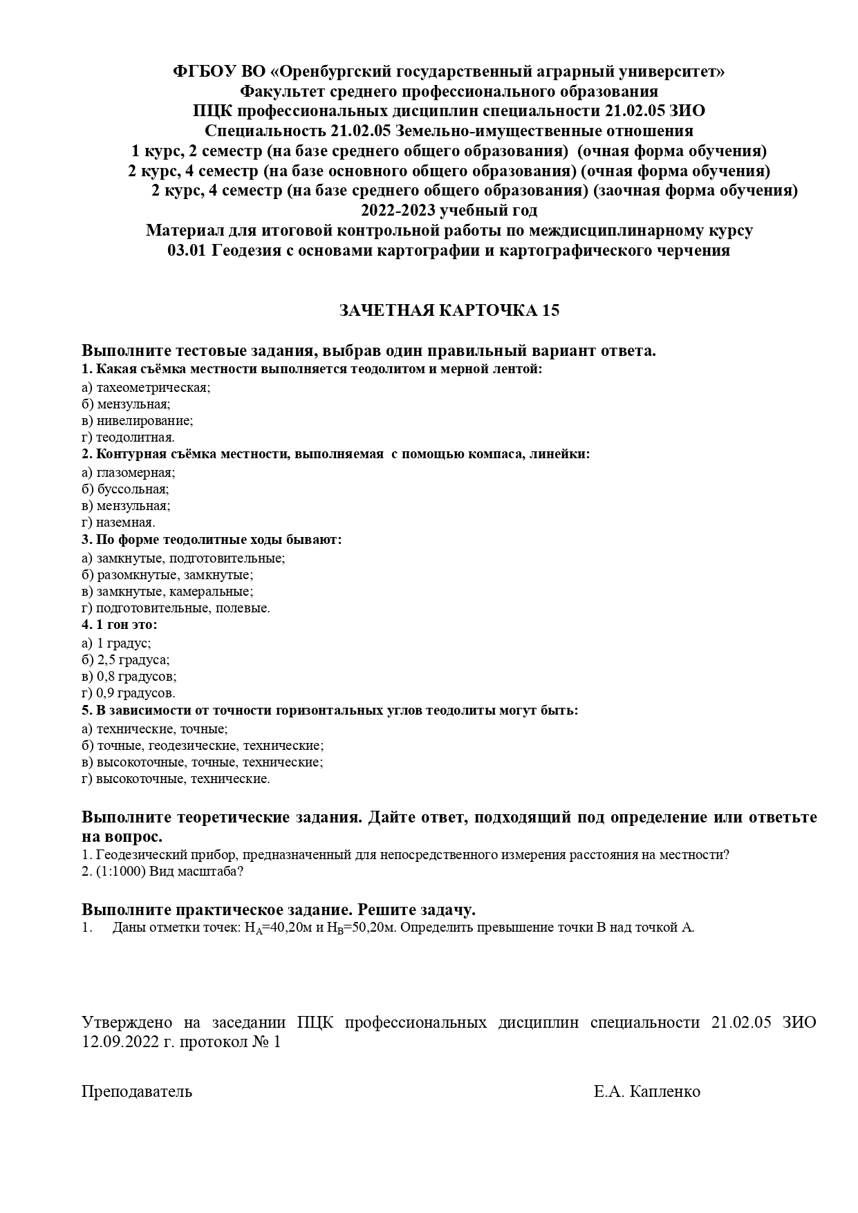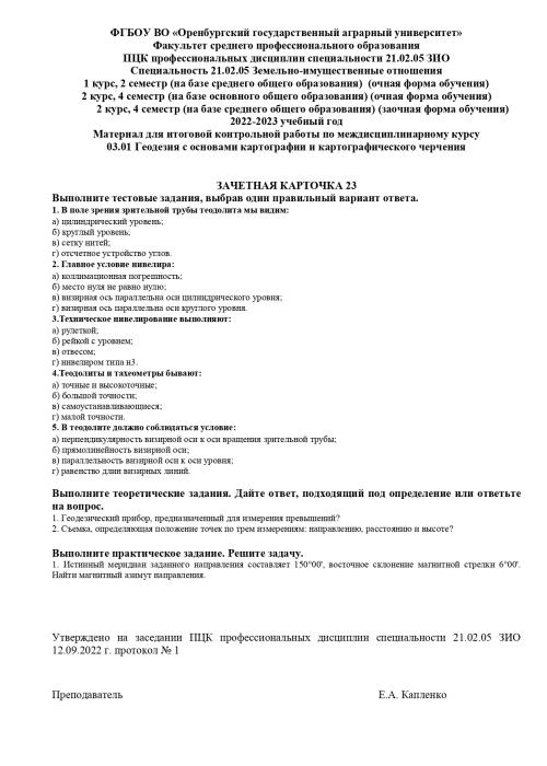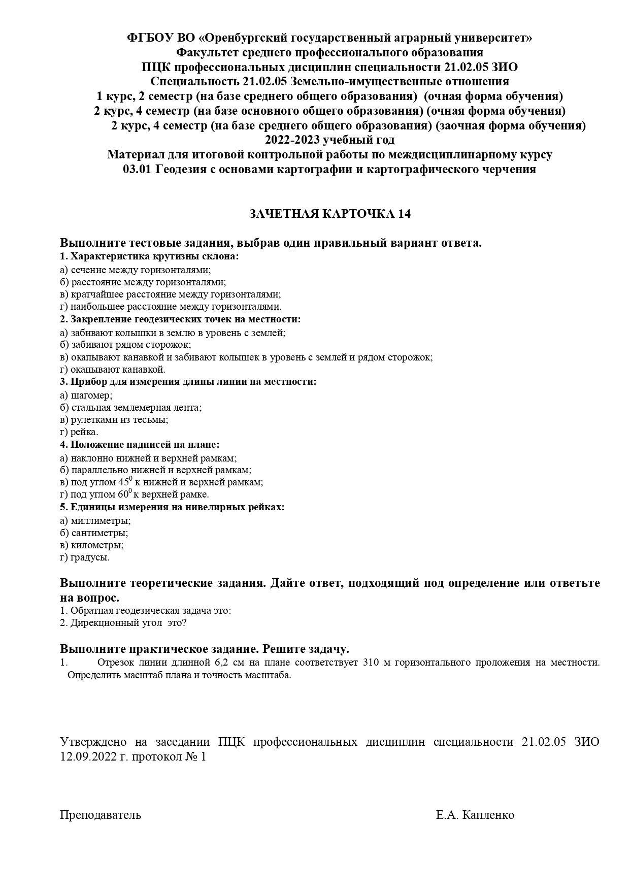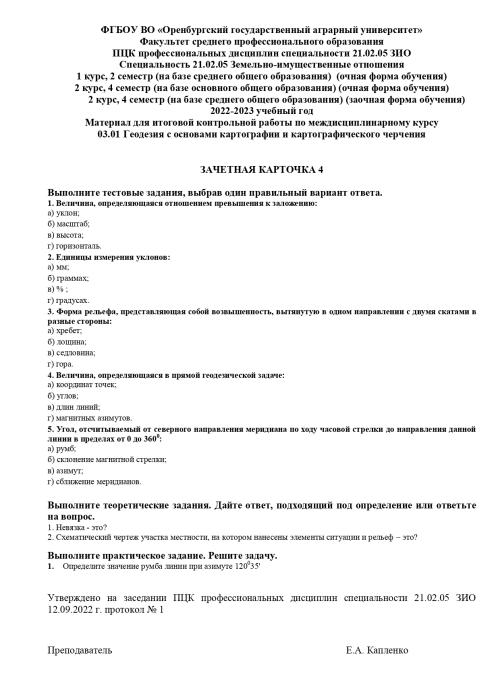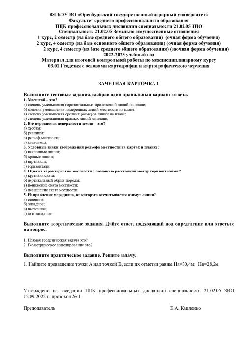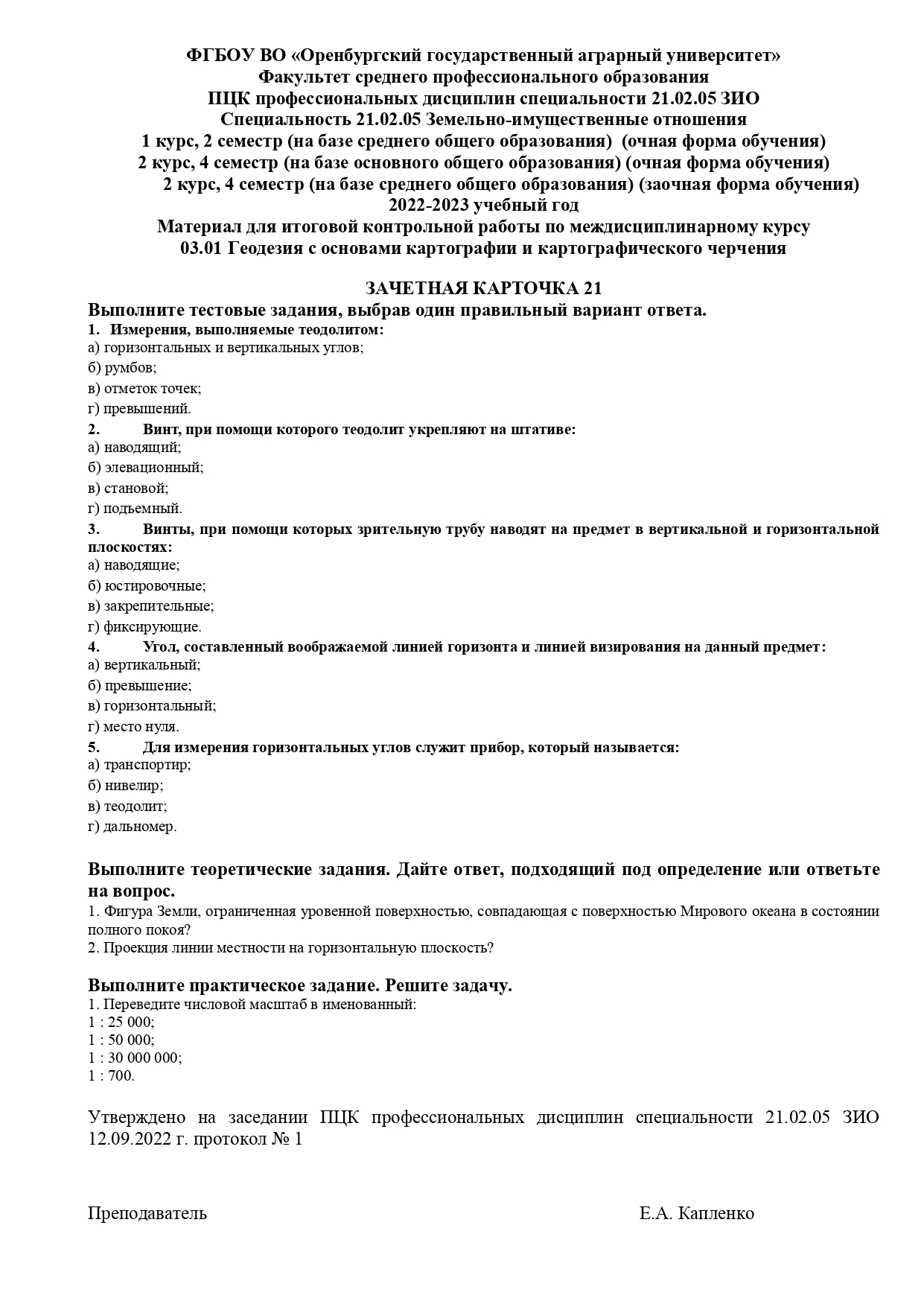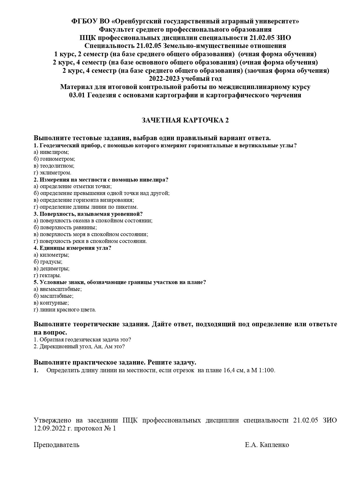 Материал для итоговой контрольной работы ПМ 03 Геодезия с основами картографии и картографического черчения, 2022-2023 учебный год