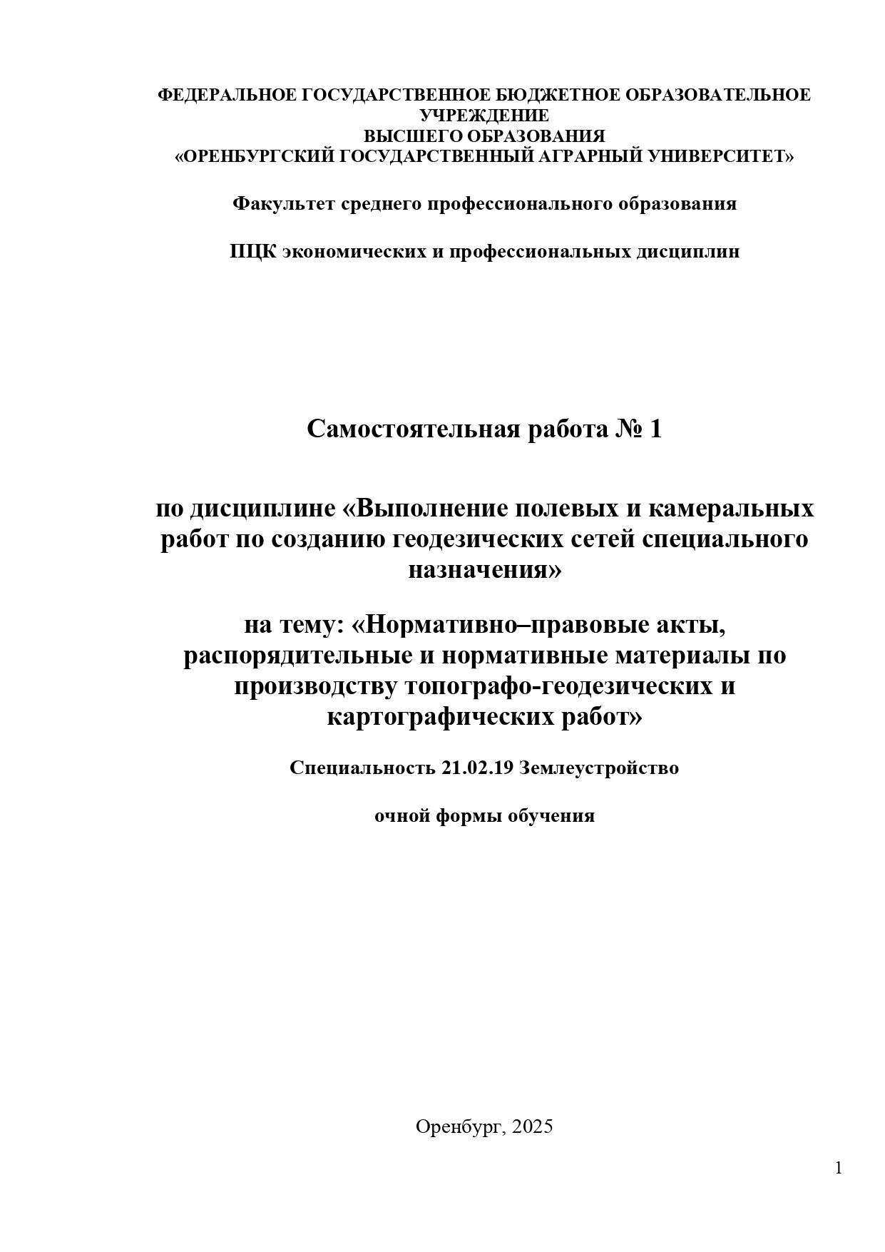 С/Р № 1 по ПМ 01 на тему «Нормативно–правовые акты, распорядительные и нормативные материалы по производству топографо-геодезических и картографических работ»