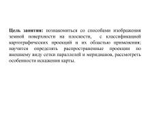 Цель занятия: познакомиться со способами изображения земной поверхности на плоскости,  с классификацией картографических проекций и их областью применения; научится определять распространенные проекции по внешнему виду сетки параллелей и меридианов, рассмотреть особенности искажения карты.