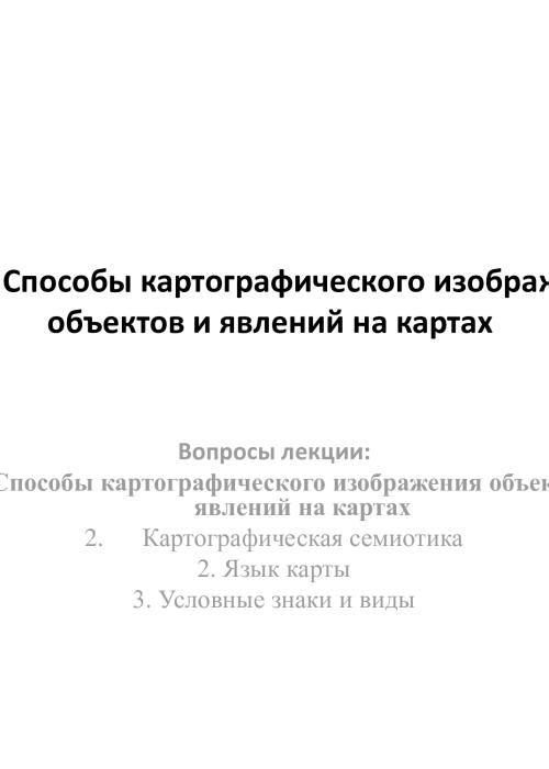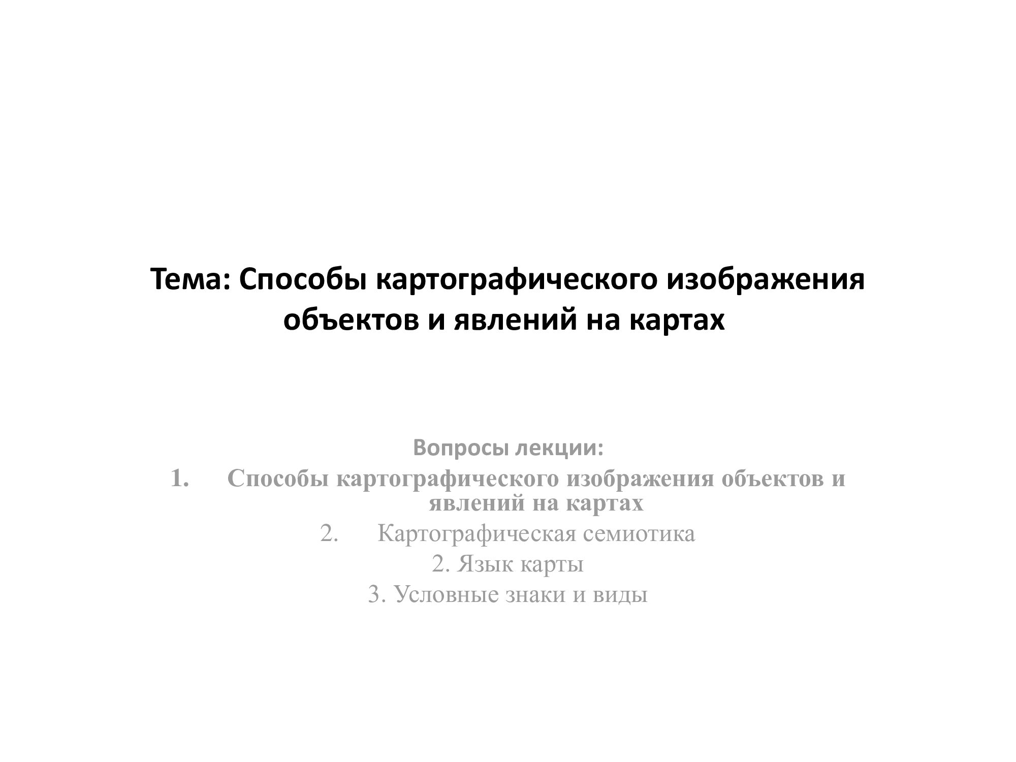 Вопросы: 1.Способы картографического изображения объектов и явлений на картах, 2.Картографическая семиотика, 2. Язык карты, 3. Условные знаки и виды.
