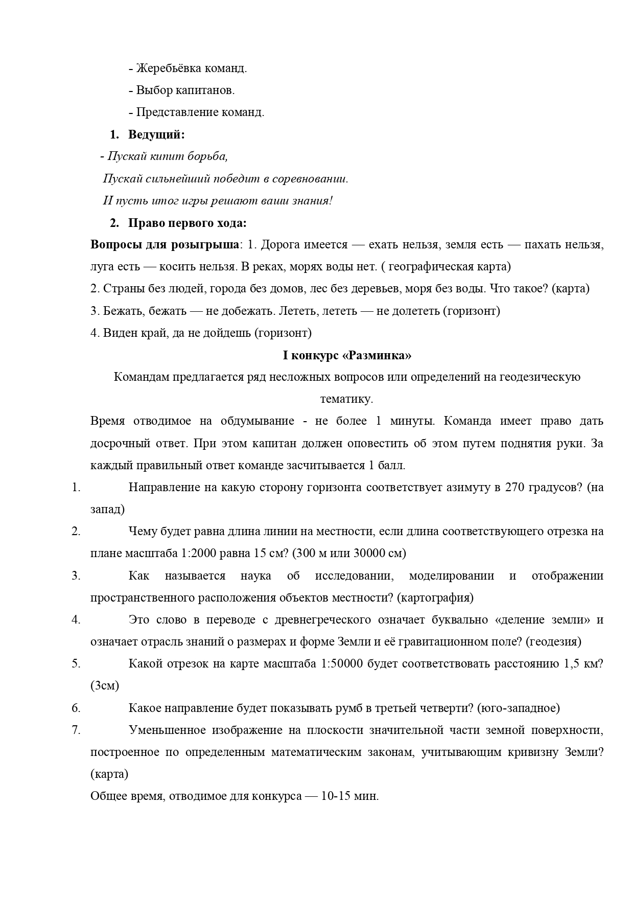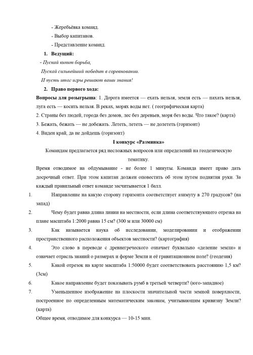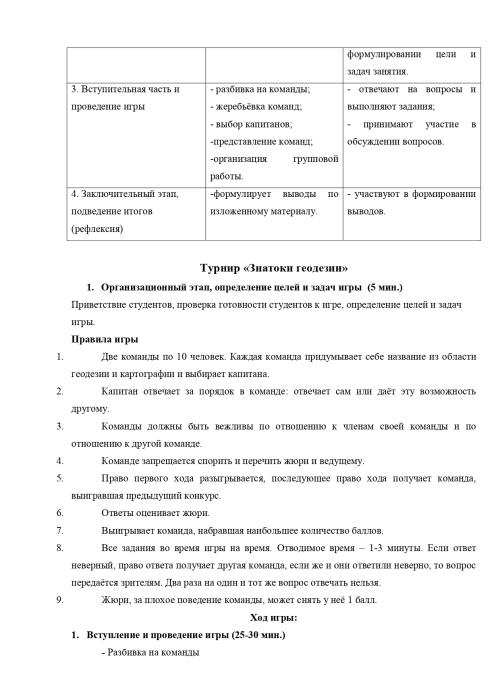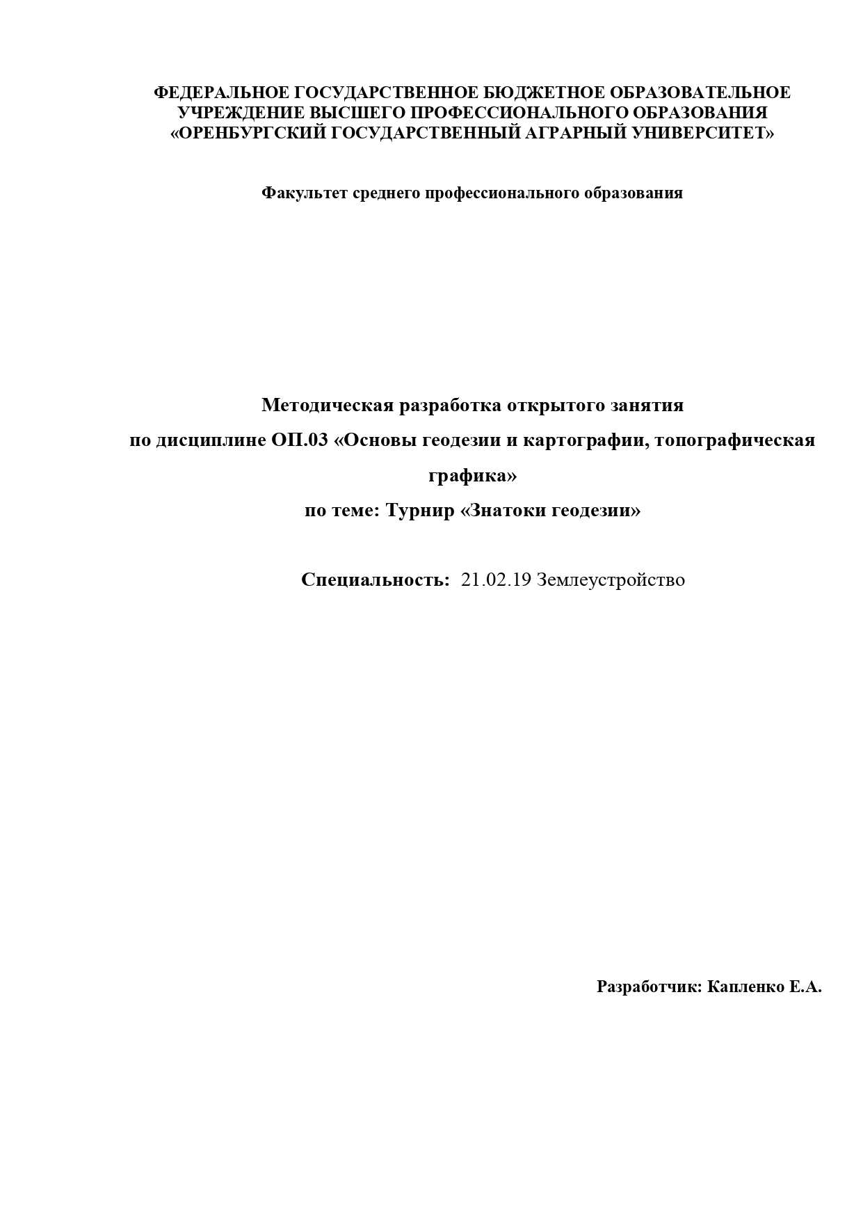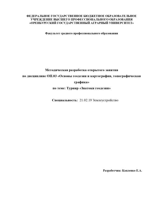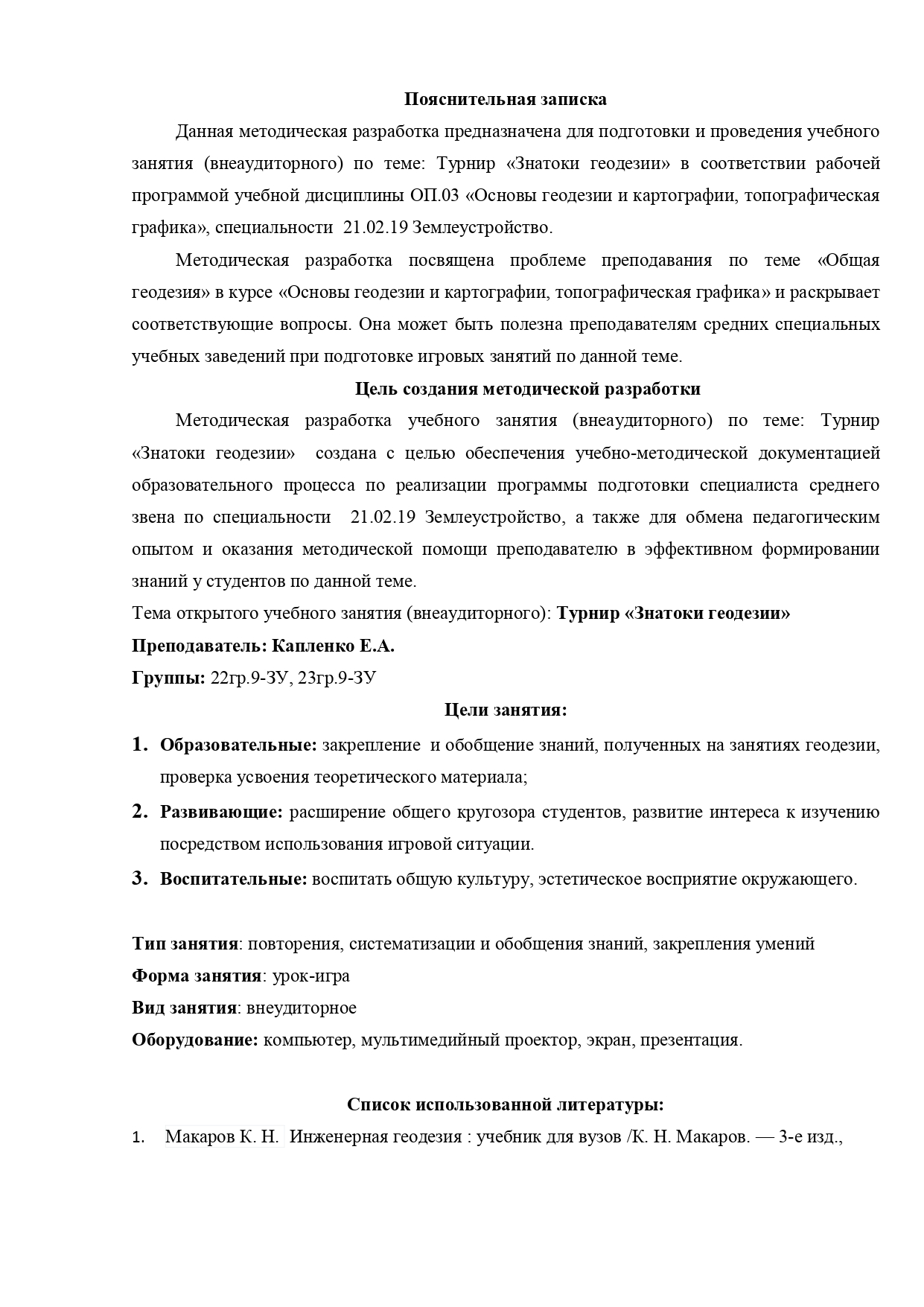 Данная методическая разработка предназначена для подготовки и проведения учебного занятия (внеаудиторного) по теме: Турнир «Знатоки геодезии» в соответствии рабочей программой учебной дисциплины ОП.03 «Основы геодезии и картографии, топографическая графика», специальности 21.02.19 Землеустройство.