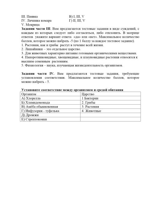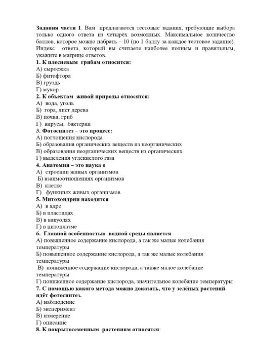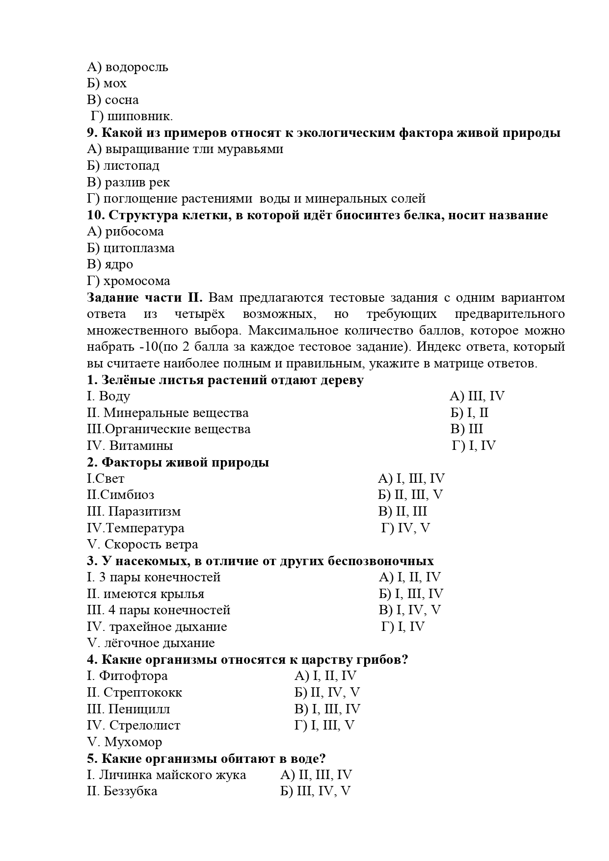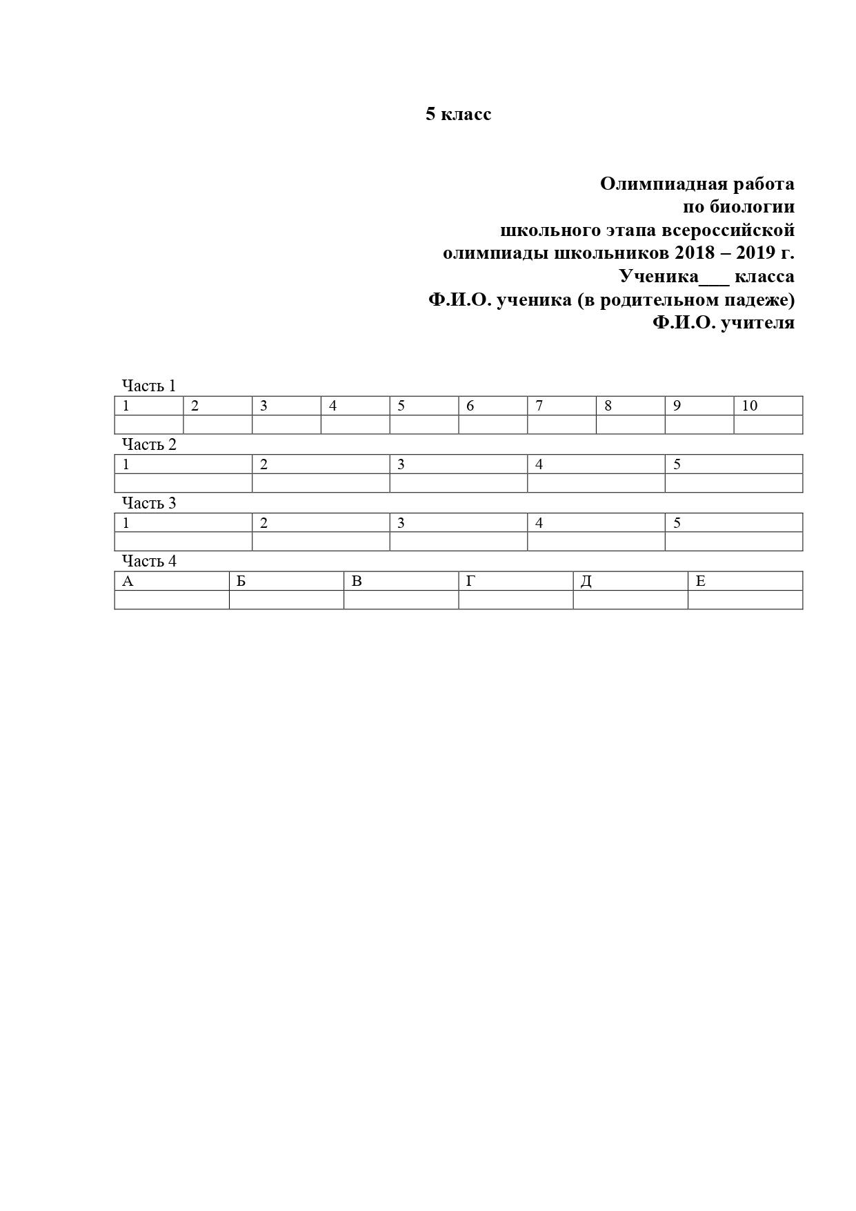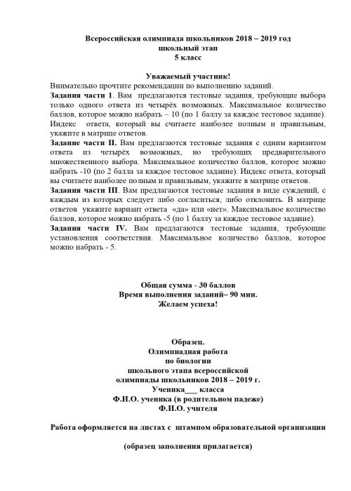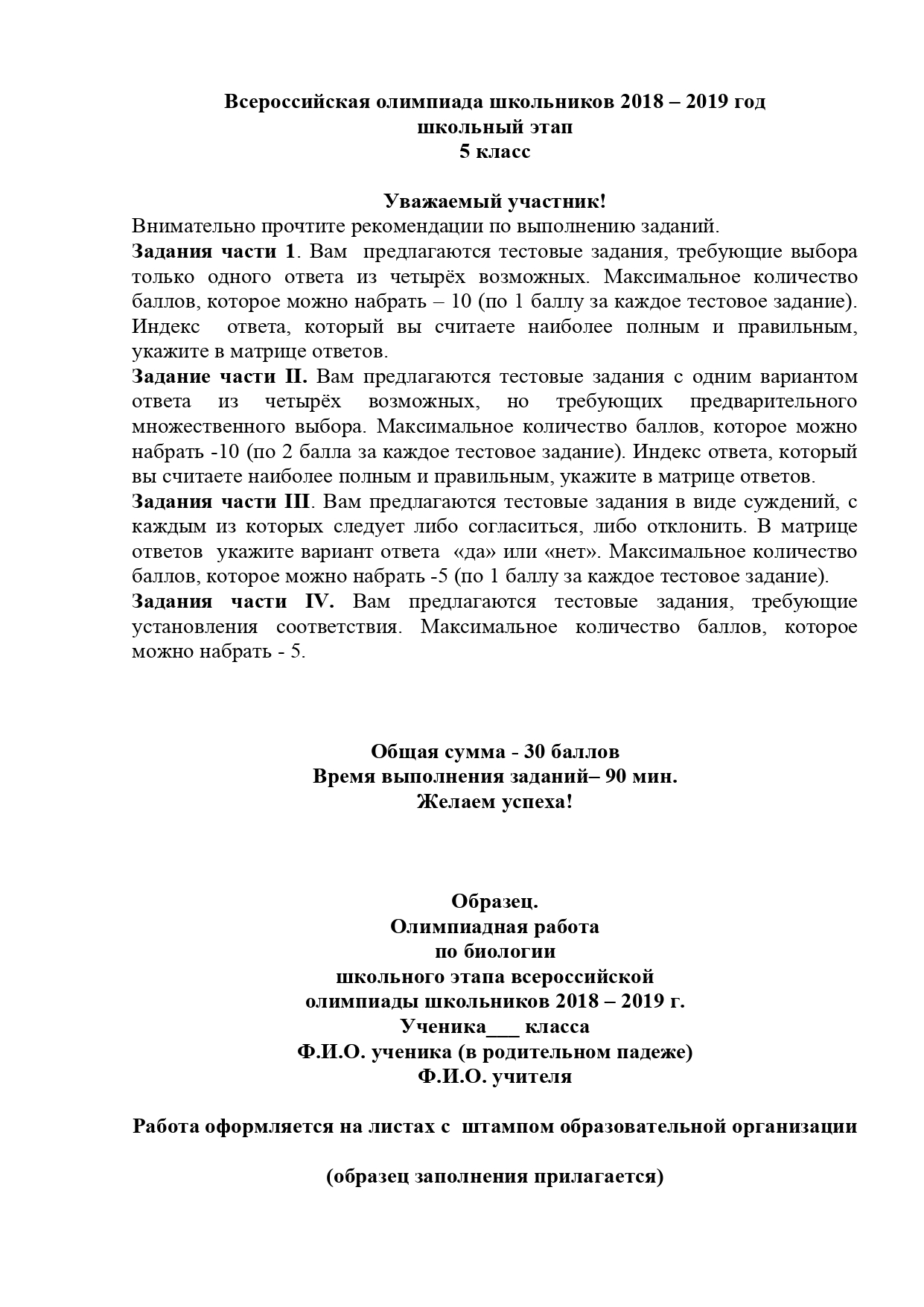 Всероссийская олимпиада школьников по биологии 2018 – 2019 год школьный этап 5 класс