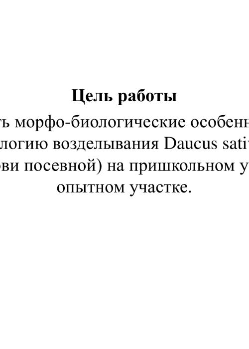 Презентация к проектной работе "Морфо-биологические особенности моркови посевной (Daucus sativus L.) и ее особенности выращивания на пришкольной территории". Рассматриваются морфо-биологические особенности и технология возделывания Daucus sativus L. (моркови посевной) на пришкольном учебно-опытном участке.