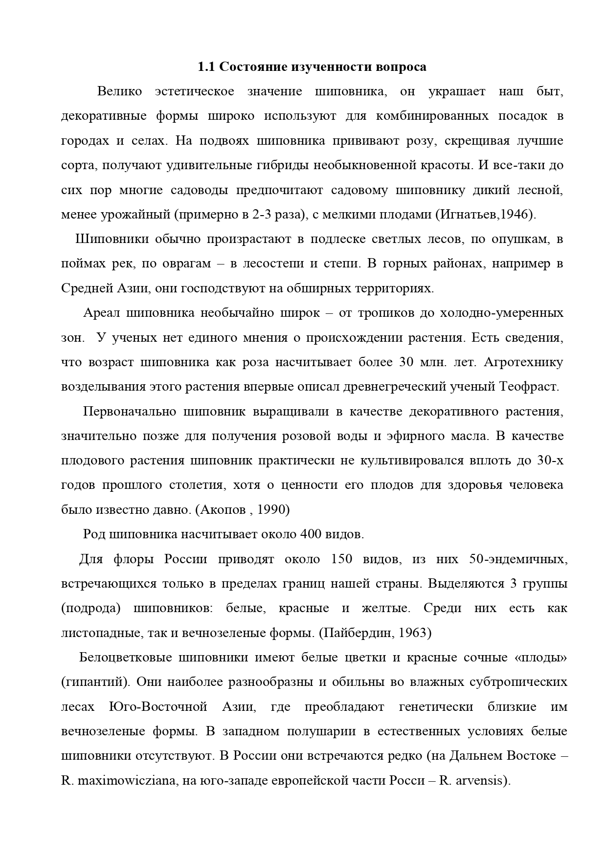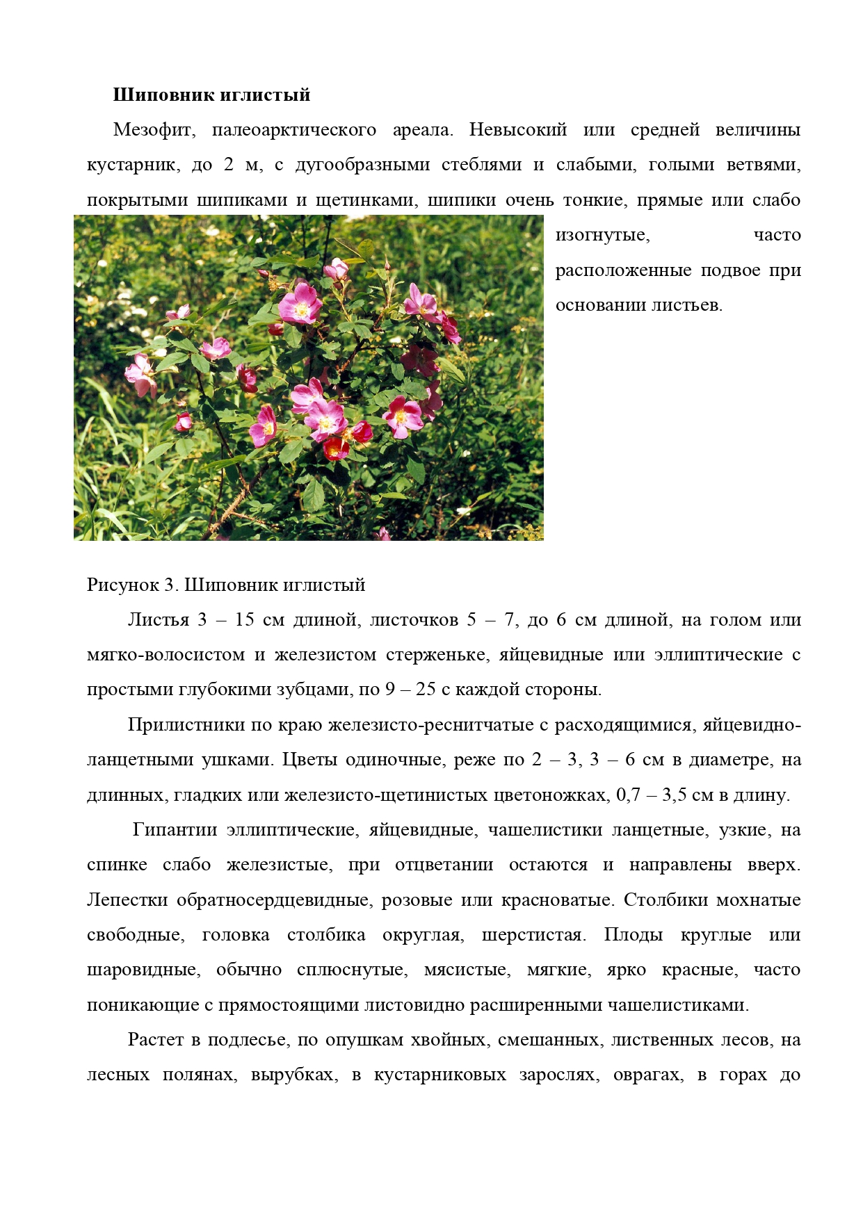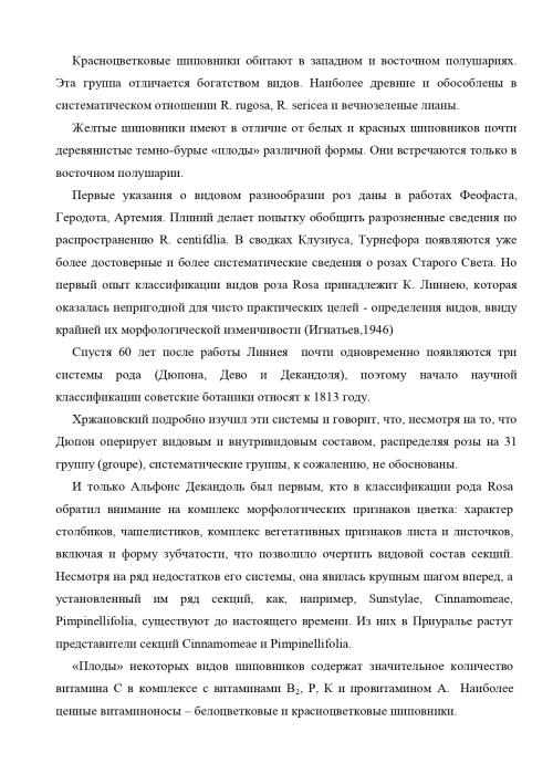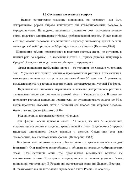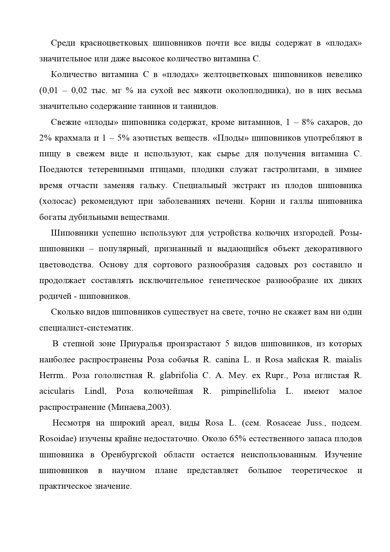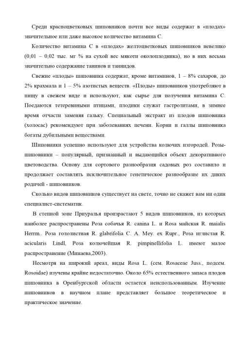 Среди кустарниковых растений роза или шиповник Rosa L. занимает особое место и был признан одним из наиболее перспективных растений благодаря содержанию в плодах целого комплекса биологически активных веществ, в частности, витаминами С или аскорбиновой кислоты, по содержанию которых шиповник занимает первое место. Кроме того, шиповник является ценным лесомелиоративным и декоративным кустарником. (Пайбердин, 1963).