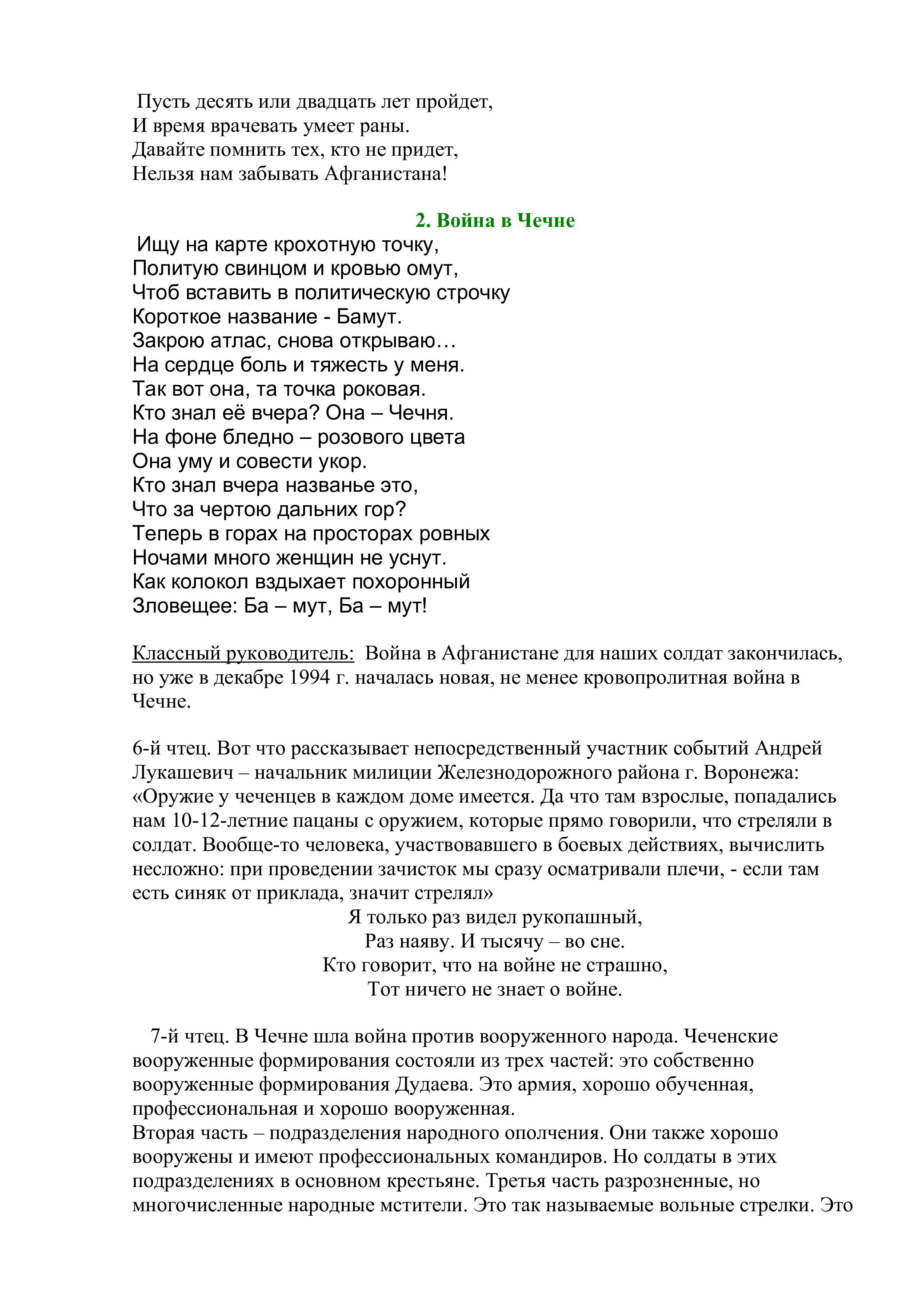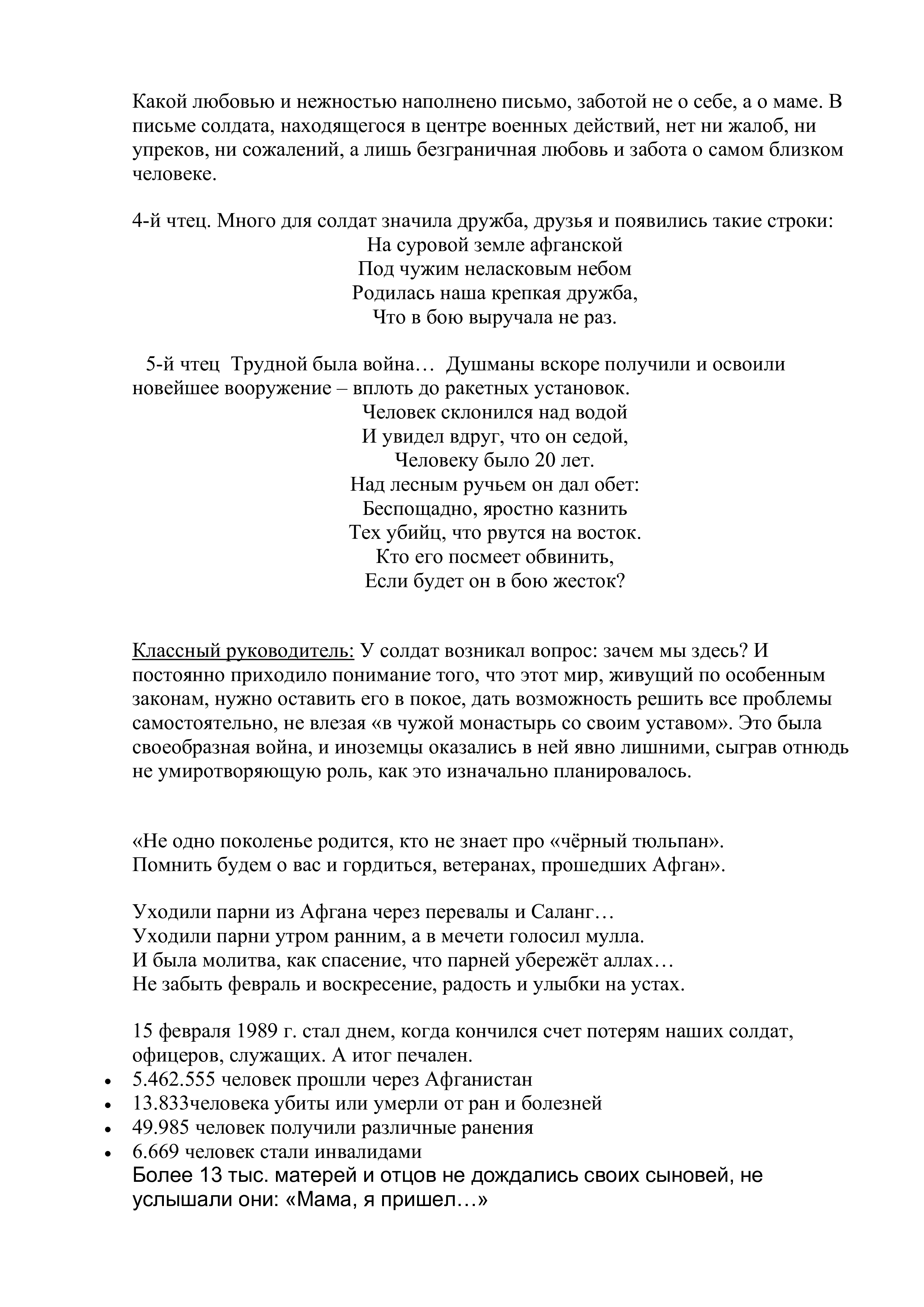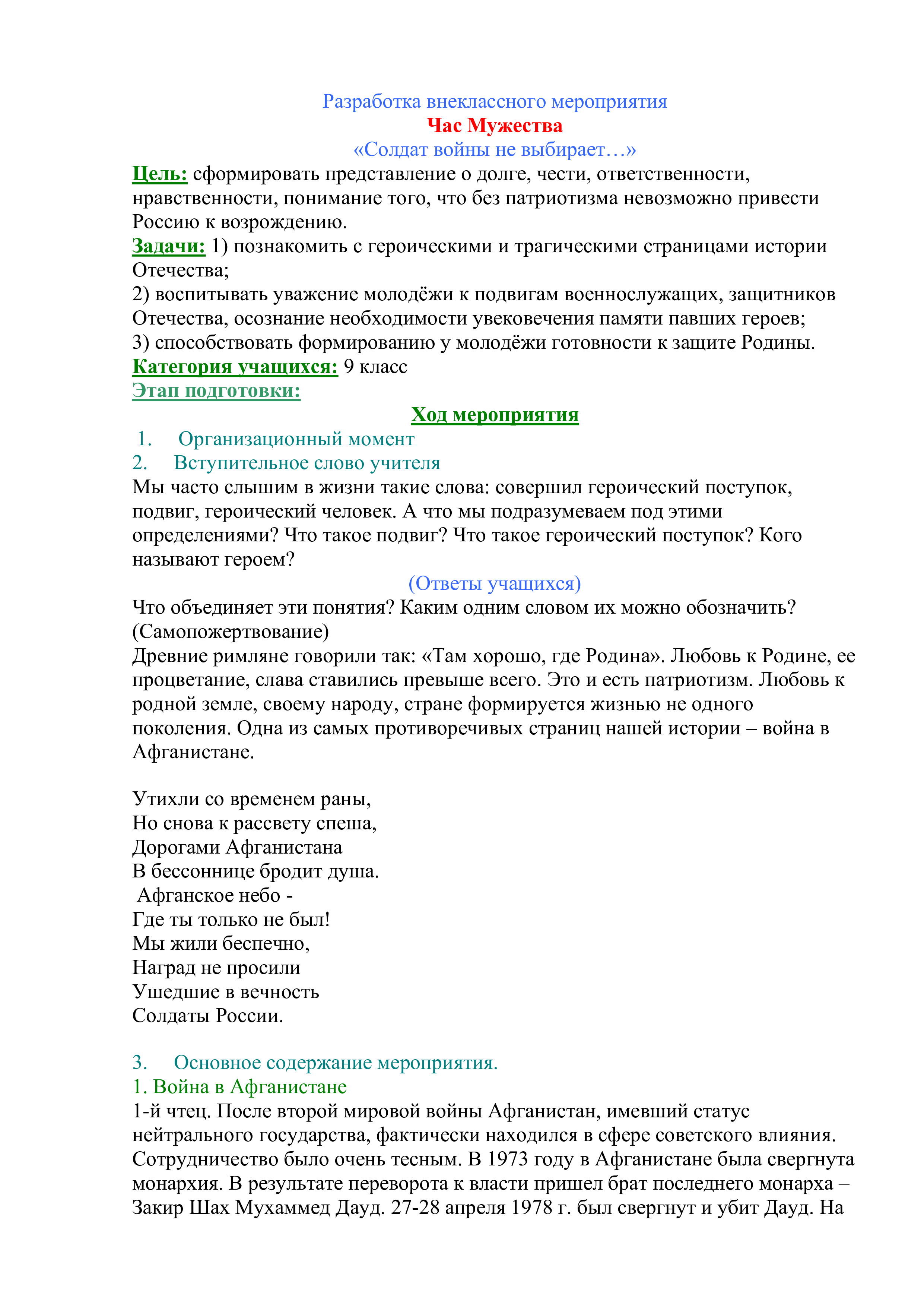 Разработка внеклассного мероприятия Час Мужества «Солдат войны не выбирает…»