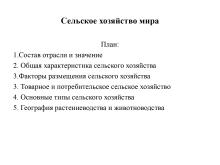 1. Состав отрасли и значение 2. Общая характеристика сельского хозяйства 3.Факторы размещения сельского хозяйства 4. Товарное и потребительское сельское хозяйство 5. Основные типы сельского хозяйства 6. География растениеводства и животноводства